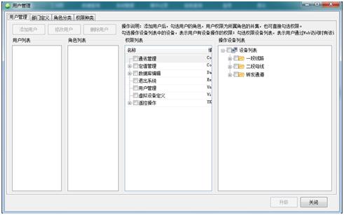 在二級菜單上點擊【用戶管理】按鈕,彈出用戶管理界面。可編輯部門、角色、用戶、角色權限和用戶權限。采用樹形結構的管理方式,部門可任意建立(無限級),部門可以設置權限,人員隨便添加到各部門中,人員可以繼承部門的權限,權限可以自定義,滿足各種復雜情況下的權限管理,在固有權限中有人員控制設備的擴展功能,不同的人員可以配置控制不同的設備。