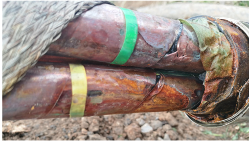 周期放電去聲磁定位,剛開始還能聽到聲音,在精確定位時發(fā)現聽不到聲音了,判斷為故障點燒穿,成為低阻故障,所以聲音減小,現場人員告知此處有一接頭,停止放電挖出接頭后發(fā)現接頭外觀完好,反復搖晃電纜接頭,繼續(xù)打壓,在接頭處聽到微弱放電聲,打開接頭后發(fā)現接頭進水。